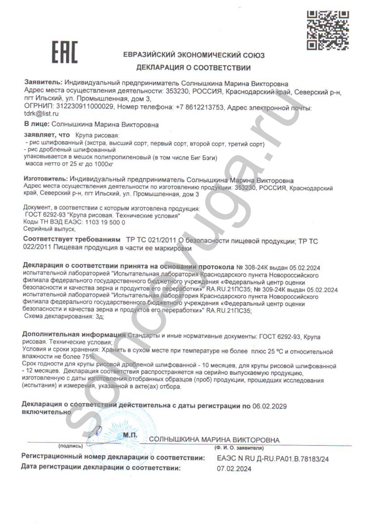 Декларация действительна до: 10.05.2027 Код ТН ВЭД ЕАЭС 1104291700