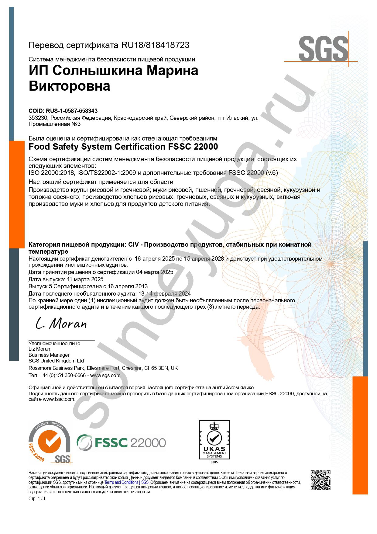 Настоящий сертификат действителен с 16 апреля 2025 по 15 апреля 2028 и действует при удовлетворительном прохождении инспекционных аудитов.