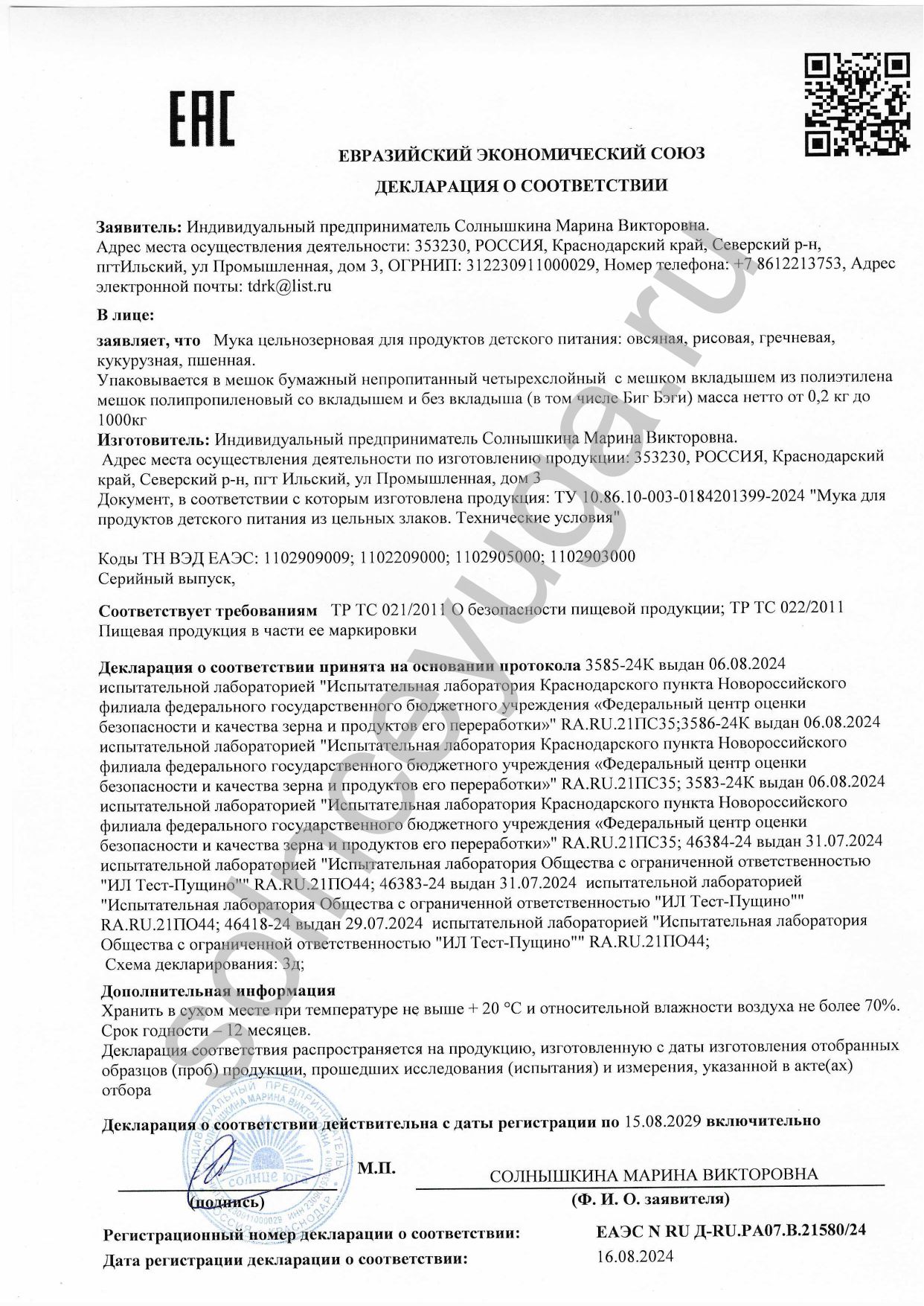 Декларация соответствия ТС, регистрационный номер ЕАЭС № RU Д-RU.РА07.В.21580/24